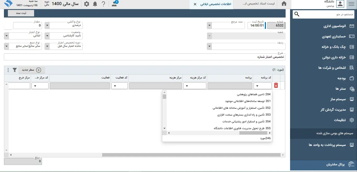 • ورود اطلاعات تعهدات و اعتبارات مربوط به سر فصل‌های حسابداری