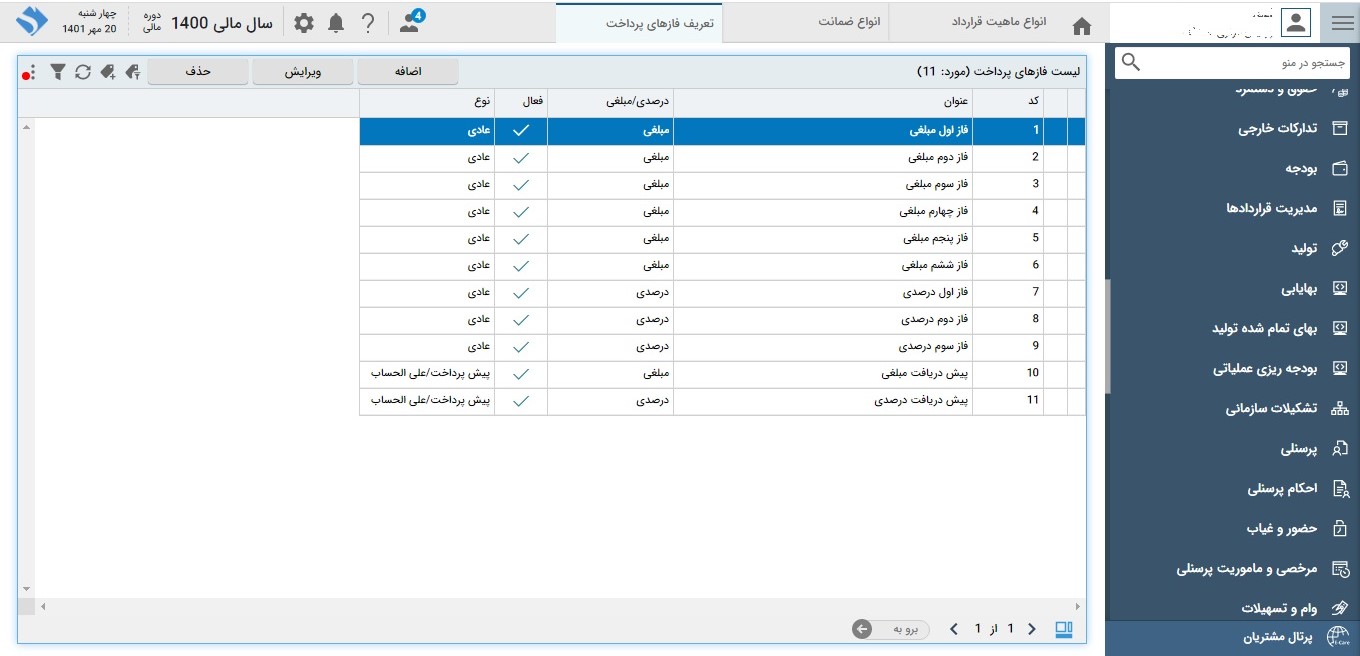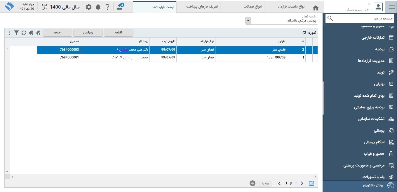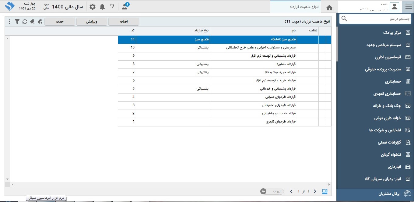 نرم افزار کنترل قراردادها با ثبت، نگهداری، اندازهگیری، کنترل قراردادها و ارائه گزارشهای مدیریتی مناسب ابزار قدرتمندی برای مدیریت و کنترل قراردادها در اختیار مدیران قرار میدهد. ثبت قراردادها و نگهداری سوابق آن از مراحل ابتدایی تا خاتمه، کنترل مالی قراردادهای منعقد شده و امکان نظارت بر پیشرفت قراردادها از مهمترین امکانات این سیستم است. این سیستم امکان یکسانسازی تمام قراردادها و کنترل آنها و کاهش ریسک خطاهای احتمالی در پیشرفت قراردادها را دارد.