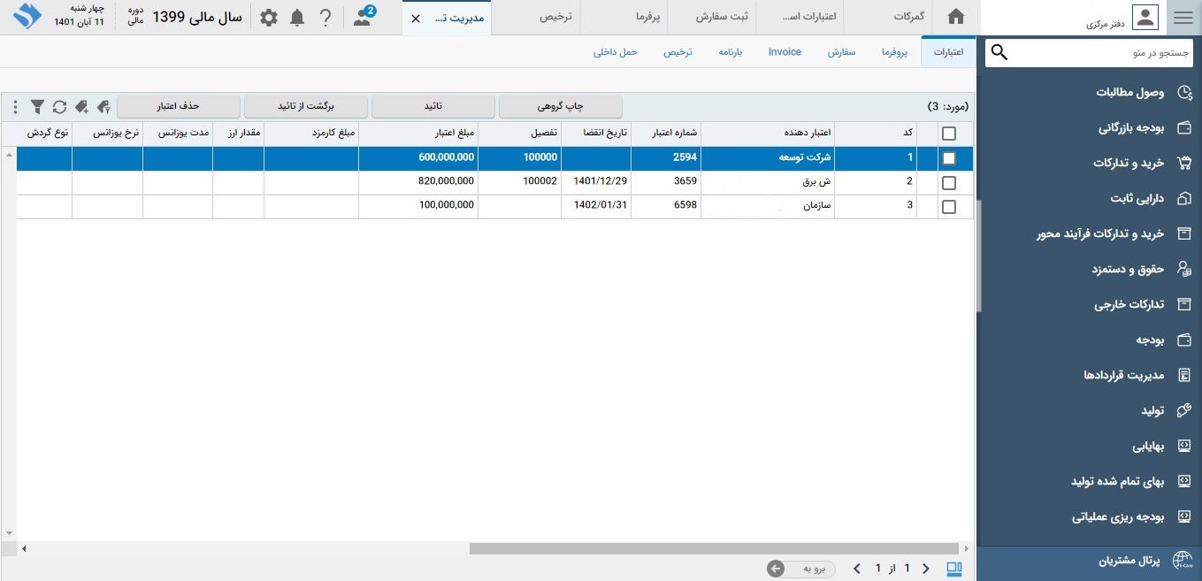 درخواست خرید کالا یا نیاز به شارژ انبار و یا ثبت سفارش خرید میتواند دو مسیر جداگانه را در سازمان طی کند؛ خرید از داخل یا تدارکات داخلی، خرید از خارج یا تدارکات خارجی. فرآیند خرید کالا از خارج از کشور، هزینههای حمل، هزینههای گمرک و ... موضوع کار نرم افزار تدارکات خارجی است. در این سیستم جریان مالی خرید، جریان تعدادی گردش کالا کنترل و ثبت شده و در قالب اسناد اتوماتیک حسابداری و اسناد ثبت ورود کالا با سیستم انبار تعامل برقرار میکند.